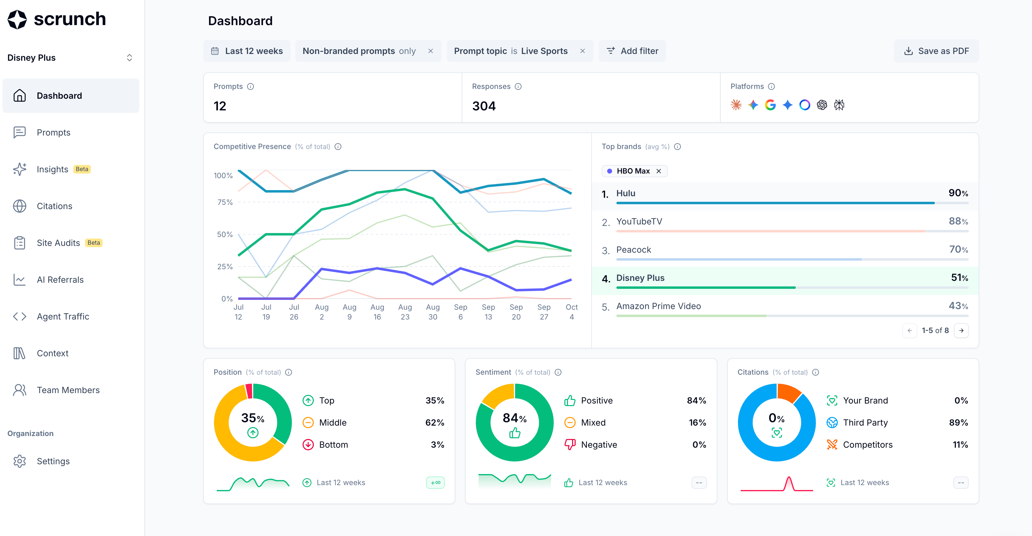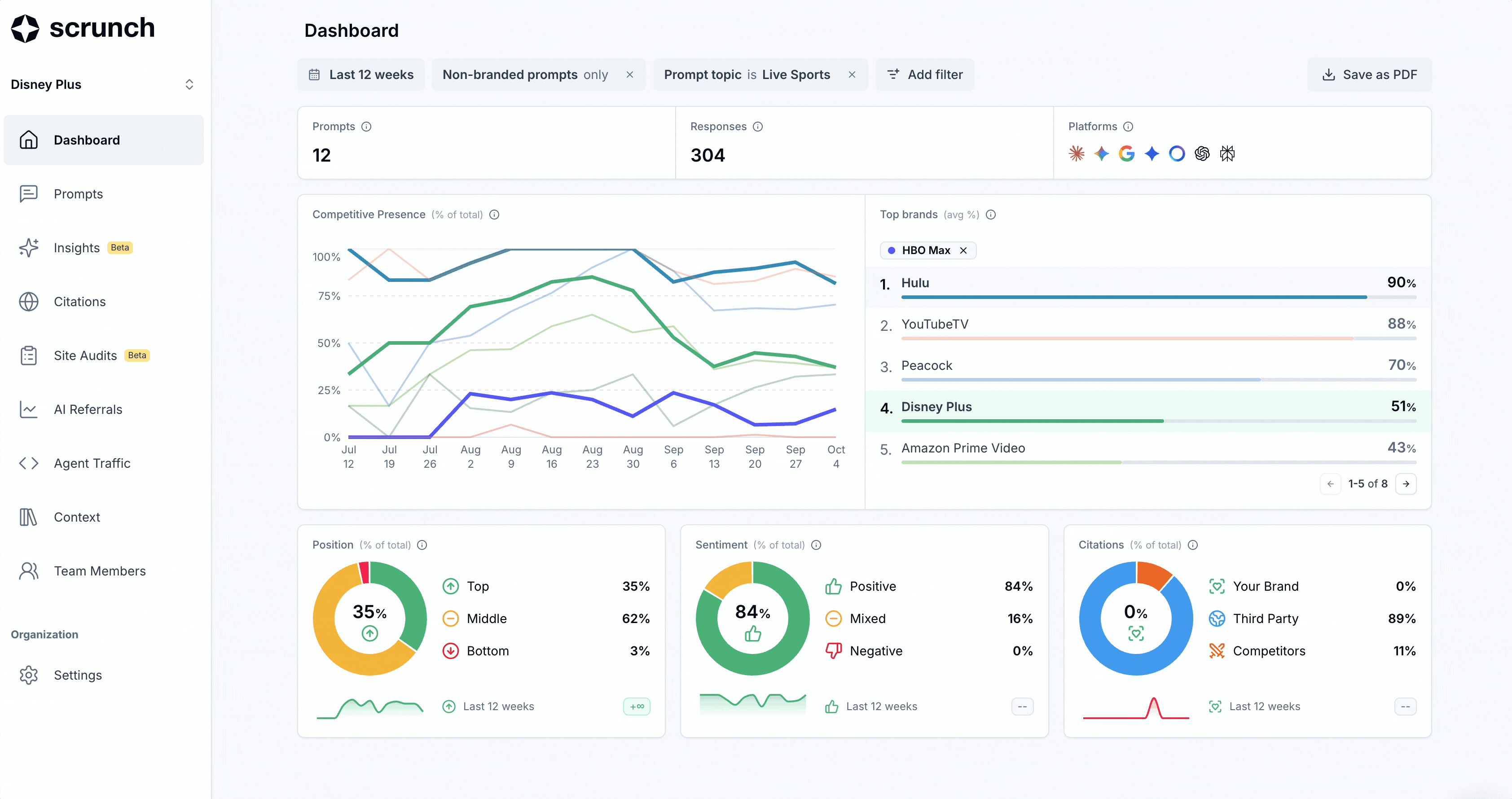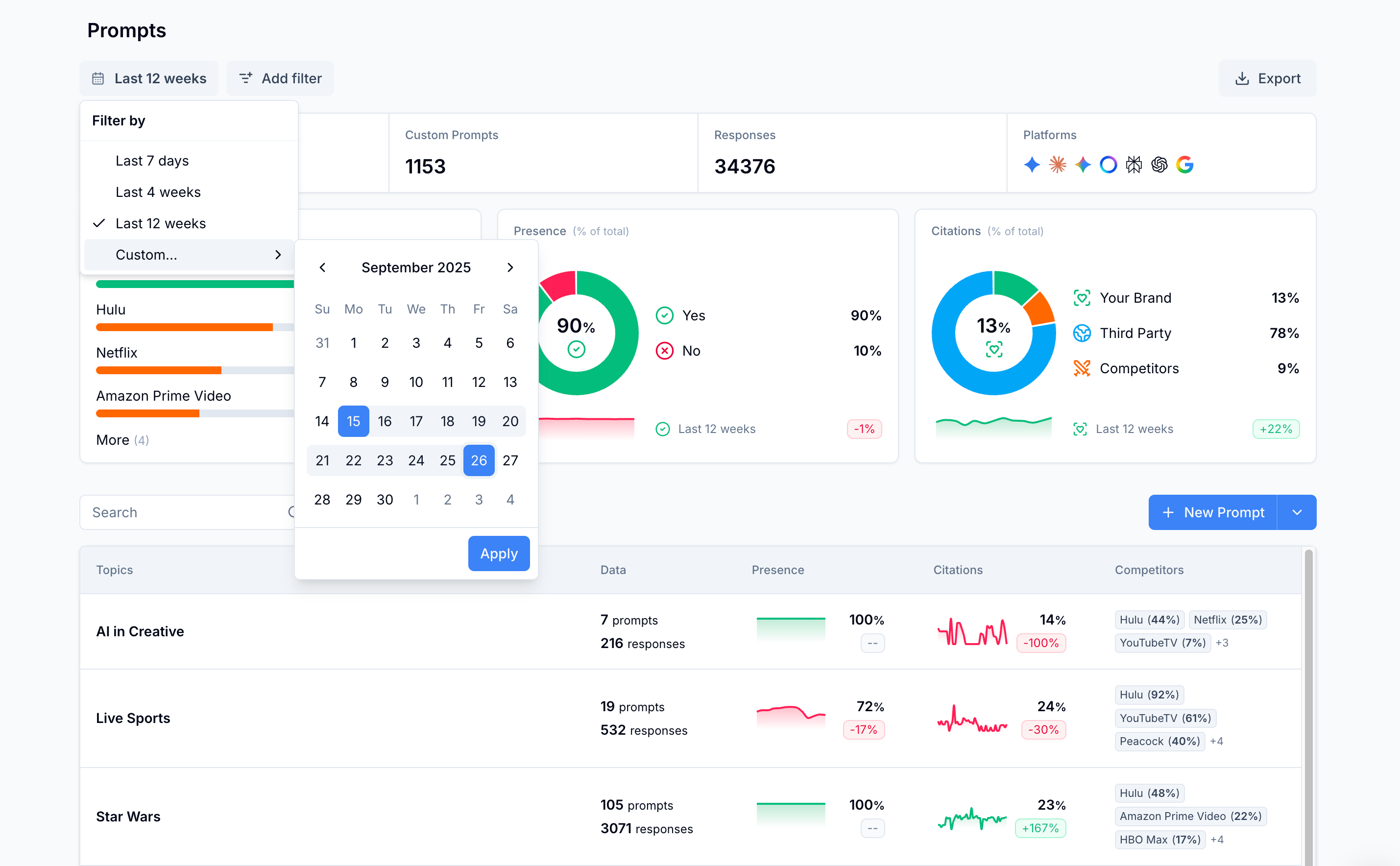 You can now select and apply custom date ranges across all of Scrunch. Yes, it’s a table-stakes feature, but one that’s recently available in the last couple weeks. In addition to the Competitive Presence dashboard, custom data ranges can also be applied views for Prompts and Citations.